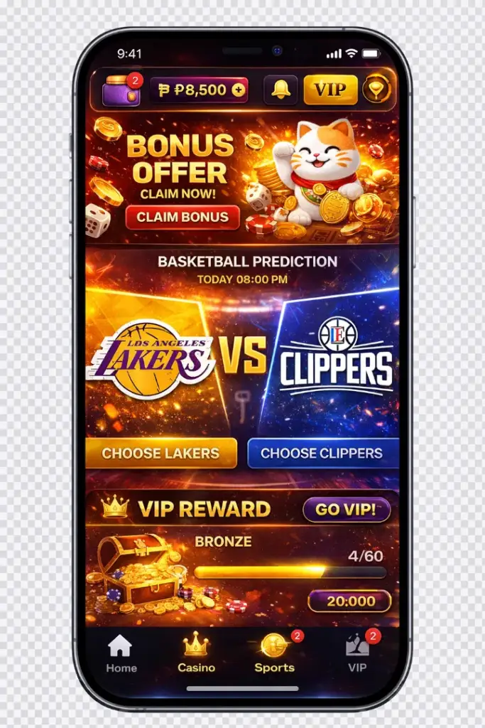 “Create a mobile screen mockup with Playtime Casino app interface, showing bonus offers, basketball match predictions, and VIP reward tabs.”